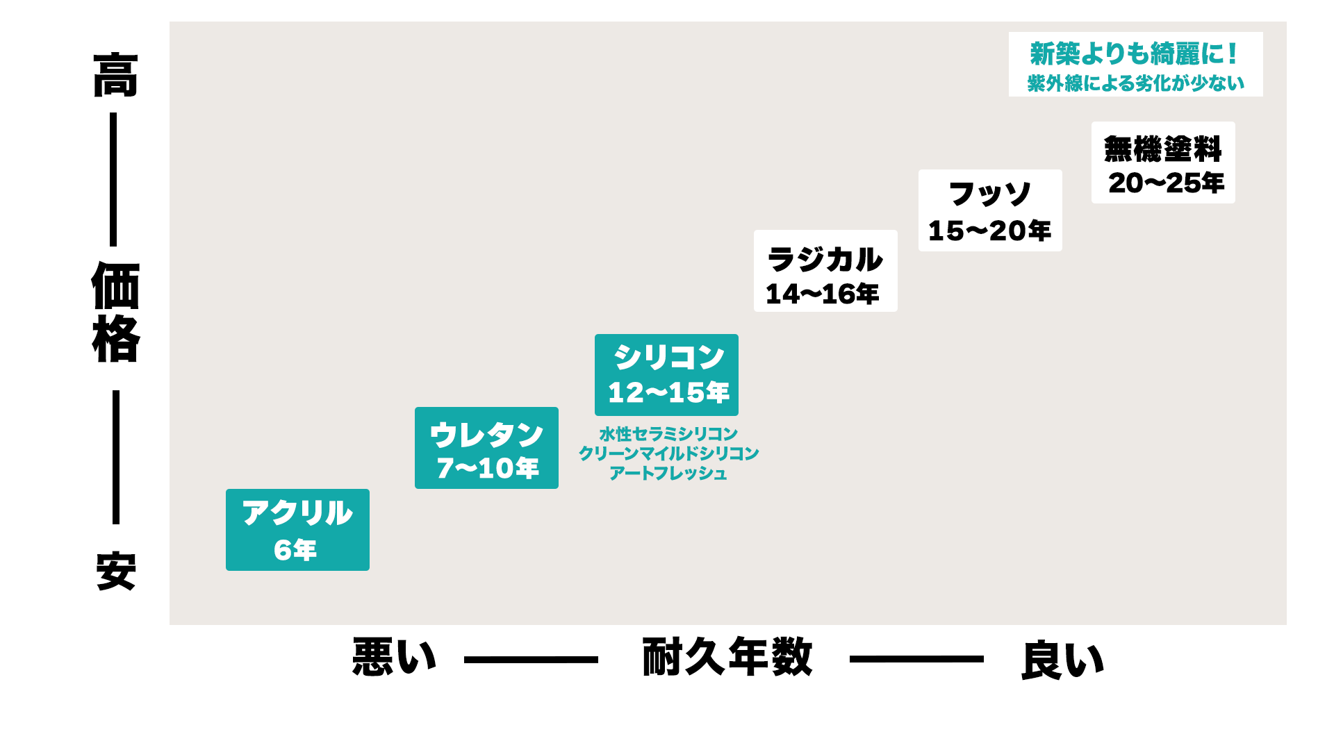 アクリル→ウレタン→シリコン→ラジカル→無機→無機フッ素